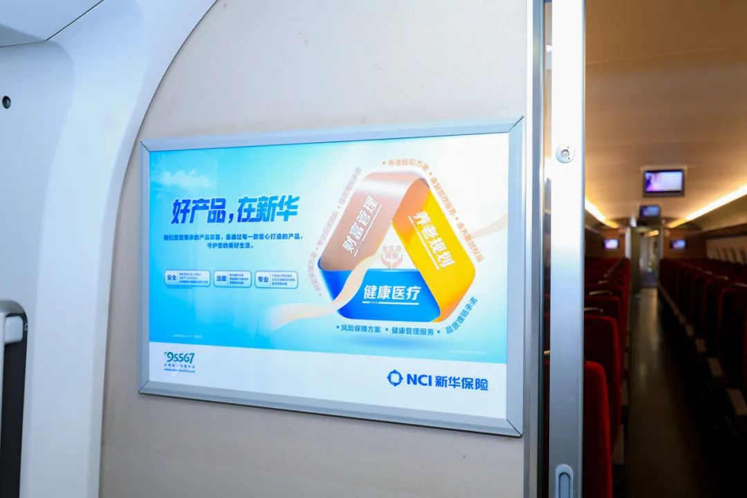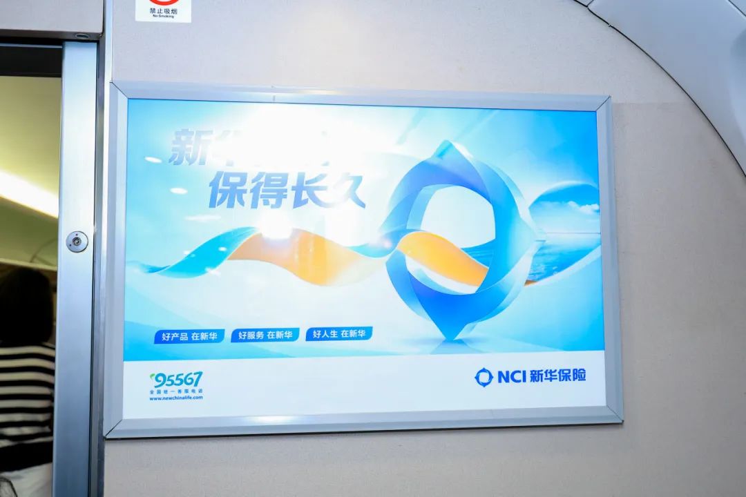 现场人员共同为新华保险冠名列车揭幕,印有“新华保险保得长久”标语的冠名列车如破晓之光般璀璨亮相。步入车厢内部,新华保险的品牌叙事便立体化铺陈开来——头片、桌贴、海报、品牌天目、语音播报、LED股东平、门贴等全媒体形式,构建独属于新华保险的品牌沉浸式体验空间,让品牌价值更具象可感。“新华红运季”分红险产品信息也在目之所及处清晰可见,在“保得长久保得美好"的品牌承诺中夯实信赖基石。这列冠名列车,传递的不仅是品牌实力,更是新华保险专业服务、稳健经营的自信,与服务民生、守护幸福的坚定信念。这抹蓝色,是新华人365天不间断的守护!