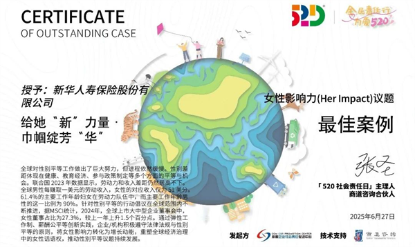 新华保险深入贯彻“金融为民”理念,在贵州施秉探索“保险+公益”融合扶贫新模式,系统构建健康保障、就业支持与非遗传承相结合的女性赋能路径。“给她''新''力量·巾帼绽芳''华''”项目成功入选“520社会责任日”“女性影响力(Her Impact)”议题,并荣获该主题唯一“最佳案例”,充分展现公司在女性赋能领域的领先实践与标杆价值。
