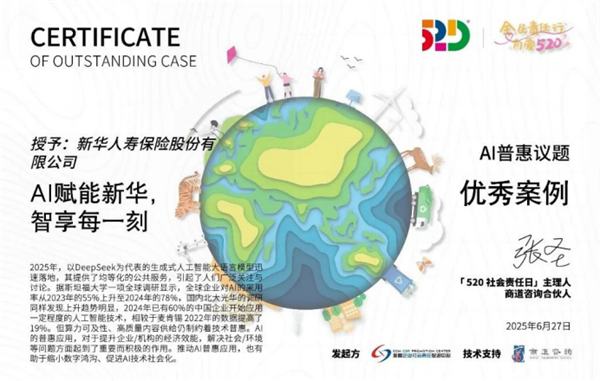 新华保险将数字化转型作为普惠金融战略的重要引擎,聚焦客户触达难、服务效率低等关键痛点,持续推进智能服务体系建设与技术应用创新。"AI赋能新华,智享每一刻"项目入选“520社会责任日”“AI普惠”议题优秀案例,充分展现科技赋能提升服务可及性、均衡性和便捷性的实践成效与引领作用。