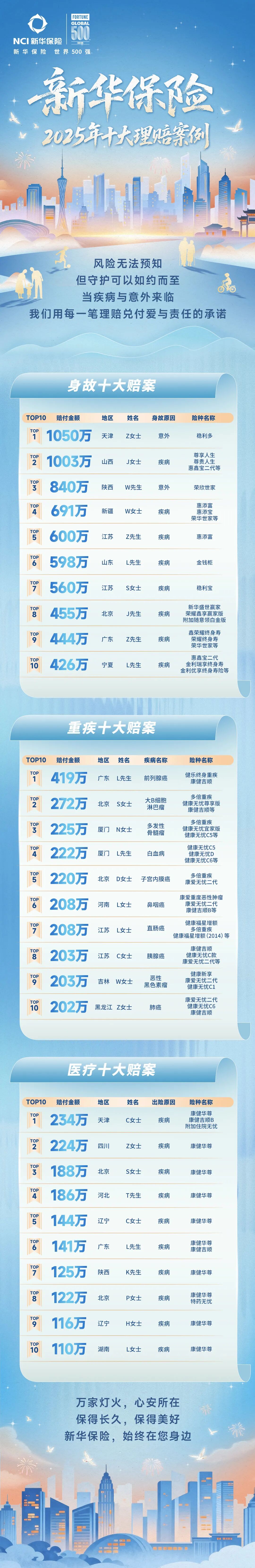 最高赔付1050万元!新华保险发布2025年十大理赔案例