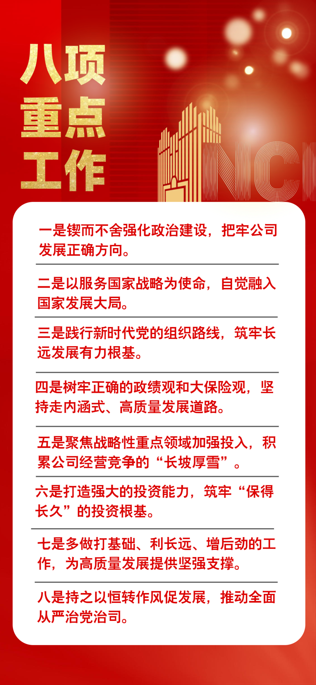 会议指出,2026年,新华保险要以习近平新时代中国特色社会主义思想为指导,全面贯彻落实党中央精神和中投公司部署要求,坚持以高质量党建为引领、以服务国家战略为使命、以践行大保险观为方向,坚持正确的政绩观、发展观,坚定不移走内涵式、高质量发展道路,守正创新、战略谋篇,科学编制和执行好“十五五”战略规划,做深做实“以客户为中心、以队伍为根本、以员工为伙伴”的战略主线,完善“保险+投资+服务”三端协同发展模式,纵深推进专业化、体系化、市场化改革,持续提升长期竞争力,实现“十五五”发展良好开局,昂首迈向公司成立三十周年新征程。总体要求做好八项重点工作——