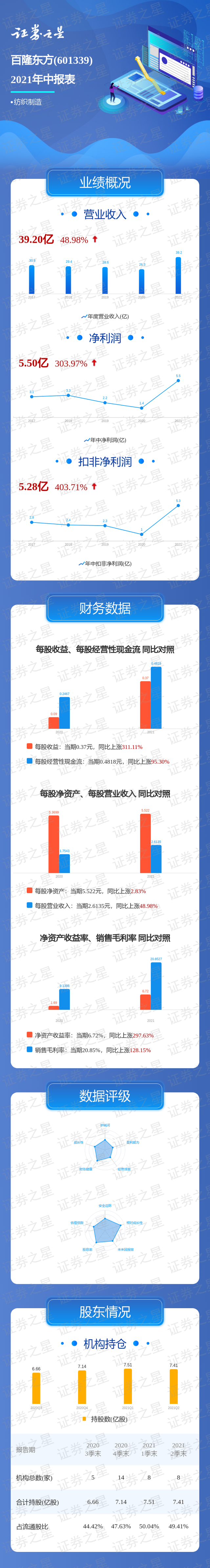 百隆东方2021中报显示,公司主营收入39.2亿元,同比上升48.98%;归母净利润5.5亿元,同比上升303.97%;扣非净利润5.28亿元,同比上升403.71%;负债率40.15%,投资收益0.88亿元,财务费用0.67亿元,毛利率20.85%。