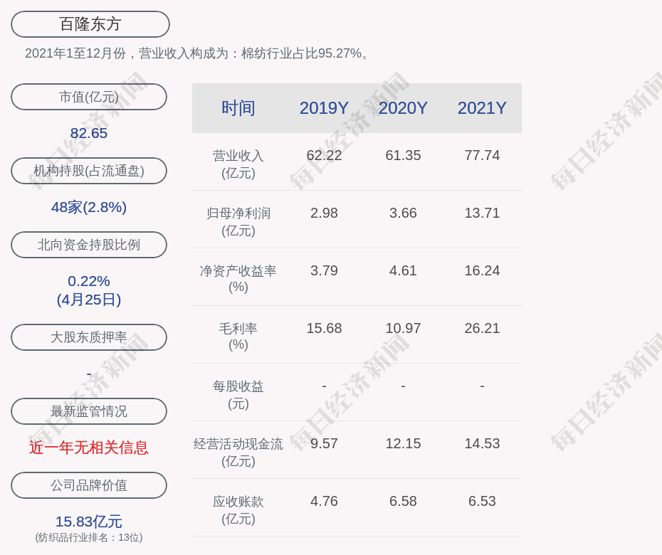 2021年1至12月份,百隆东方的营业收入构成为:棉纺行业占比95.27%。