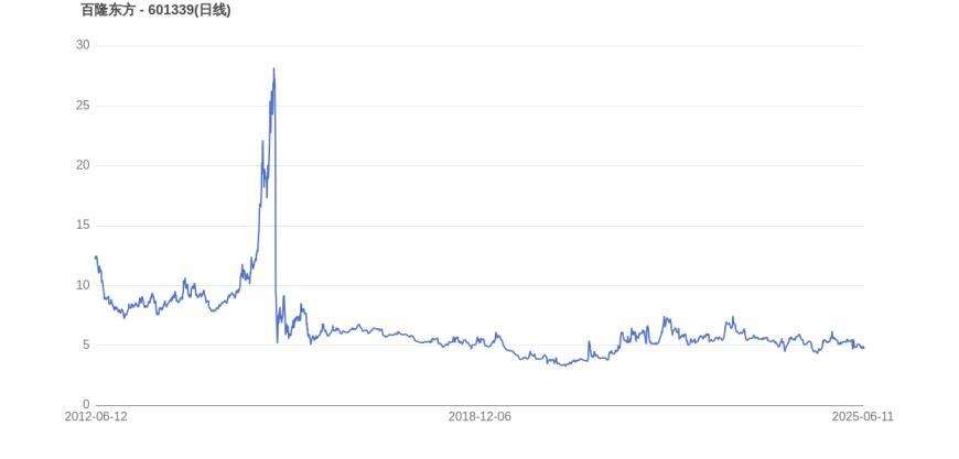 2015年6月18日,百隆东方的市值巅峰达到221.62亿元,股价也顺应升至29.55元。而至6月11日收盘,百隆东方的股价为4.83元,市值为72.43亿元,相比峰值时期市值减少149.20亿元,市值蒸发了67.32%。
