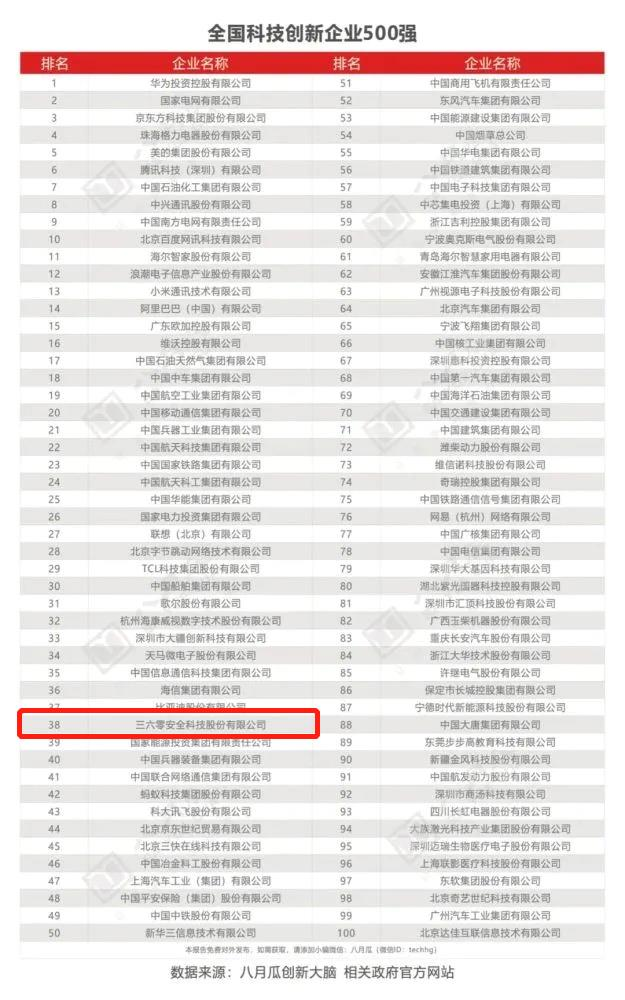 5月30日,在中国第六个“全国科技工作者日”到来之际,八月瓜创新研究院发布了《全国科技创新百强指数报告2022——企业、高校及研究机构篇》报告,这份报告聚焦企业、高校和研究机构等微观创新主体,遵从科学性、完整性、综合性、可比性、导向性等原则,制定了全国科技创新企业500强榜单。报告显示,华为、国家电网和京东方分别位列前三。三六零(601360.SH,下称“360”)集团凭借在数字安全领域的技术、产品创新,在全国范围的国企、民企中位列榜单第38位,是惟一跻身前50强的网安企业。