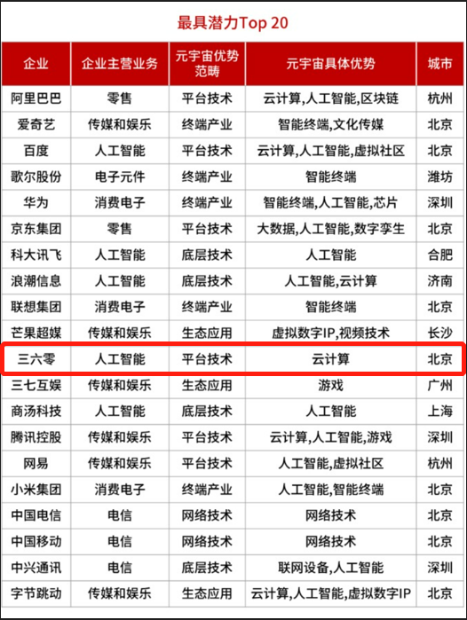榜单将元宇宙分为五大领域,分别为底层技术、生态应用、平台技术、终端产业、网络技术,360作为平台技术类的代表企业上榜。360创始人周鸿祎表示,元宇宙是数字化发展的高级阶段,进入数字文明时代,一方面是发展数字经济,另一方面需要关注数字安全。数字化在带来新机遇新场景的同时,会让安全变得更脆弱。在极端数字化的元宇宙世界,360所拥有的数字安全能力,将成为守卫虚拟世界秩序、财产安全的基石。