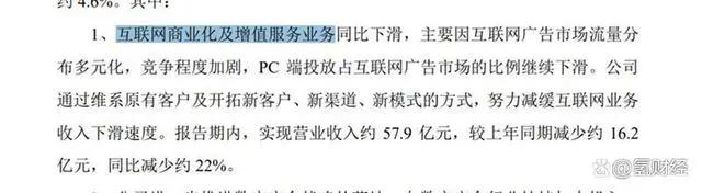 2022年三六零互联网商业化及增值服务业务实现营业收入约57.9亿元,同比减少约16.2亿元,同比下降约22%,在当期营业收入中的比重为61.01%,占比如此之大,自然影响到了三六零的整体收入表现。