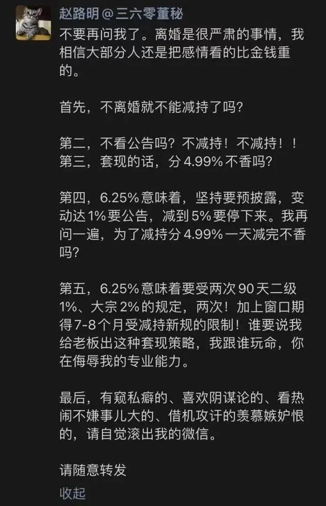 4月4日当日晚间,三六零副总裁、非独立董事、董事会秘书赵路明在朋友圈发声指责:若真为变相减持,过户股权比例在5%以下则受限更少,更有利于短期内实施减持。谁要说我给老板出这种套现策略,我跟谁玩命,你在侮辱我的专业能力。