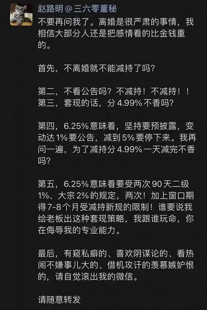赵路明还详细地列出5点对外界“离婚式减持”的猜测予以反驳。其一,不离婚也可以减持;其二,公告明确说了不减持;其三,若要套现,直接分割4.99%更“香”;其四,6.25%的股份变动,意味着减持需要预披露,且变动1%需公告,减到5%要停下来;其五,6.25%的股份变动,还意味着要受两次90天二级1%、大宗2%的规定,再加上窗口期得7个月至8个月受减持新规的限制。