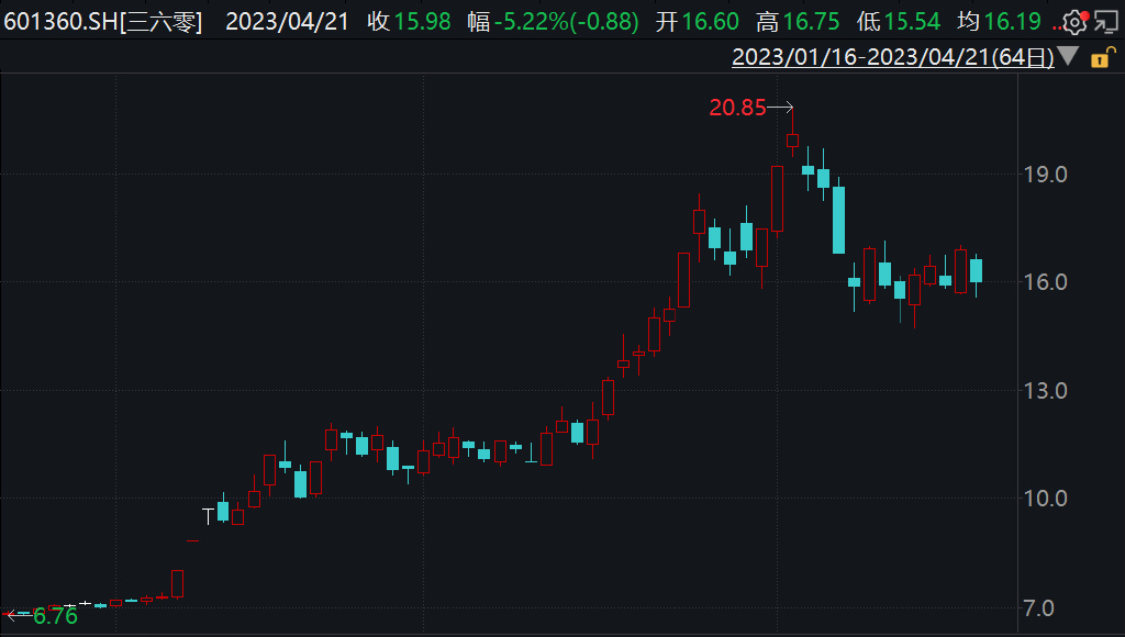 截至最新收盘日,三六零股价不到16元,和年内高点20.85元相比,回撤大约23%。