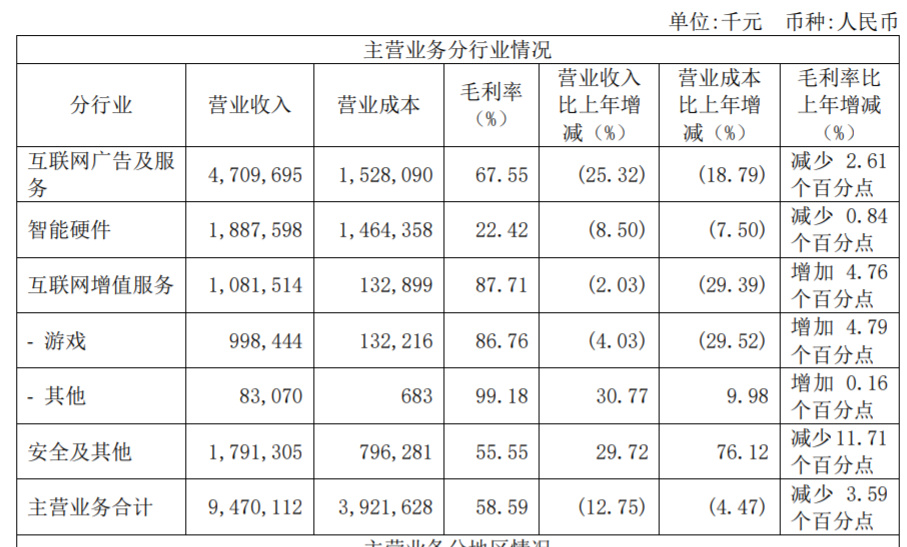 其中互联网广告及服务收入为47.1亿元,同比下降 25.32%;智能硬件业务收入为18.88亿元,同比下降 8.5%;互联网增值服务收入为10.82亿元,同比下降2.03%;安全及其他业务收入为17.91亿元,同比增长29.72%。