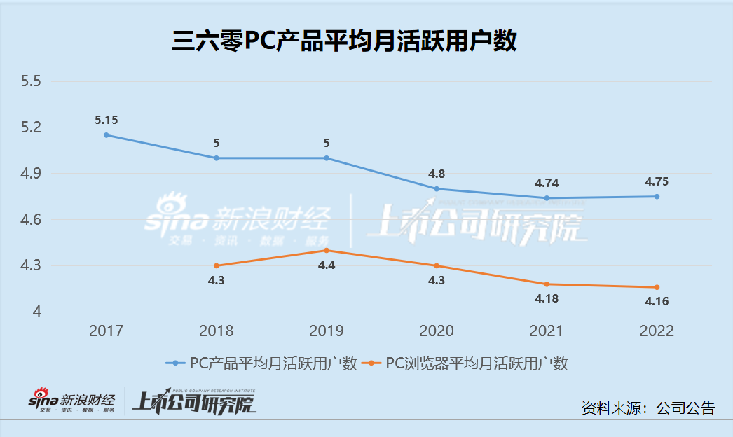此外,尽管三六零的C端产品主打免费,但频繁的广告弹出、难以卸载等特征也让很多人称其为“流氓软件”,PC端用户月活近年来接连下滑。根据艾瑞咨询的数据,PC产品平均月活从2017年的5.15亿以上下降至2022年的4.75亿,,PC浏览器平均月活从2018年的4.3亿下降至2022年的4.16亿。