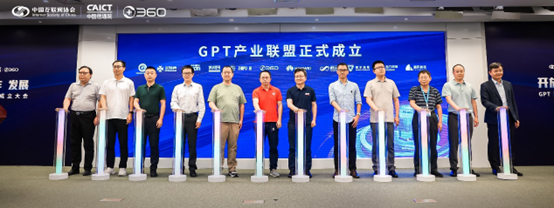 会上,360集团联合智谱AI、华为云、商汤科技、创业黑马、出门问问、云知声、澜舟科技、中关村龙门加速器等产业链企业宣布GPT产业联盟正式成立。
