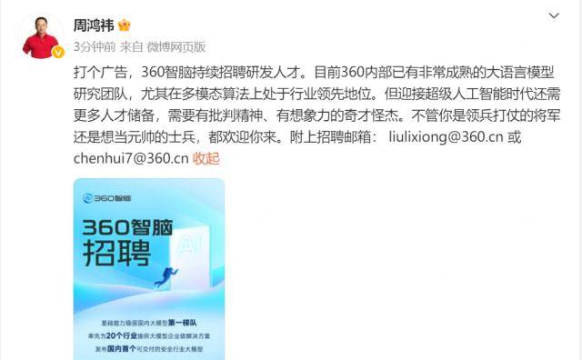 此前,360集团创始人周鸿祎曾表示“大模型或将引发失业潮”的声音是在制造焦虑,人工智能技术的发展会催生更多新职业和新的就业机会。今年4月,周鸿祎曾发内部信要求360内部全面拥抱人工智能。周鸿祎在信中透露,360内部已经有非常成熟的大语言模型研究团队,尤其在多模态算法上处于行业领先地位,360集团将推行“揭榜挂帅”制,招募更多员工加入大语言模型的核心研发,“不管你是领兵打仗的将军还是想当元帅的士兵,希望你自告奋勇”。