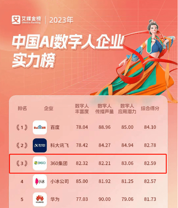 近日,iiMedia Ranking (艾媒金榜)发布了《2023年中国AI数字人企业实力榜》榜单,360集团(601360.SH,下称“360”)入围中国AI数字人企业综合实力前三名。