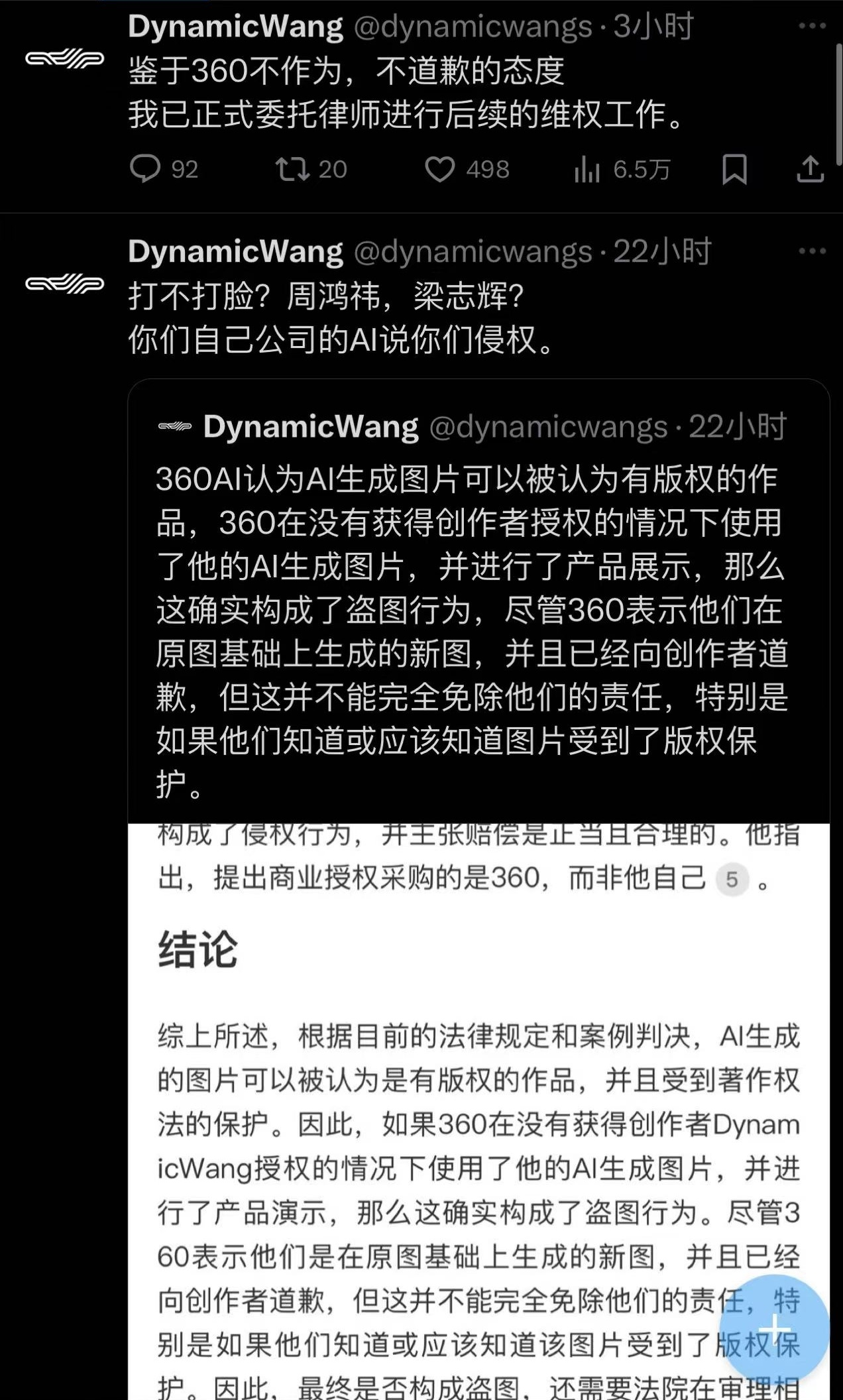 目前几轮拉扯之后,事情的最终解决方案仍未有定论。据DynamicWang最新动态表示,已经正式委托律师进行后续的维权工作。更值得关注的是,DynamicWang使用360AI对此事进行分析,而360AI则表示“如果360在没有获得创作者DynamicWang授权的情况下使用了他的AI生成图片,并进行了产品演示,那么这确实构成了盗图行为。”