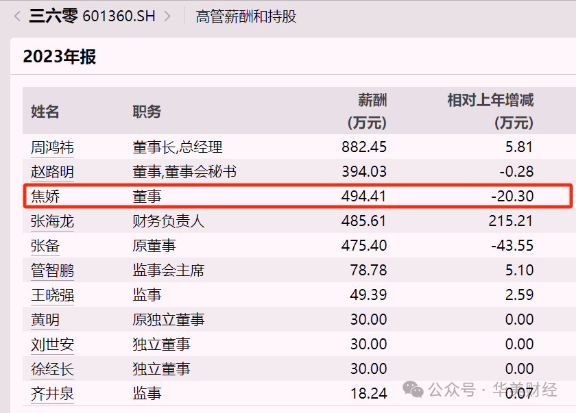 年报披露,焦娇去年薪酬为494万元,低于周鸿祎的882万元,排第二;董秘赵路明、财务负责人薪酬分别收益394万元、485万元,原董事张备薪酬475万元,监事会主席管智鹏薪酬不到79万元。独立董事薪酬也有30万元。