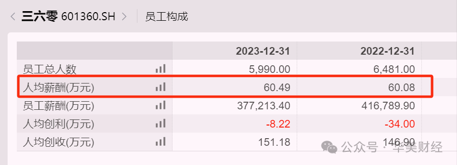 至2023年末,三六零员工数量约6000人,研发人员超过一半,去年人均薪酬约60.5万元,比2022年略有增加。