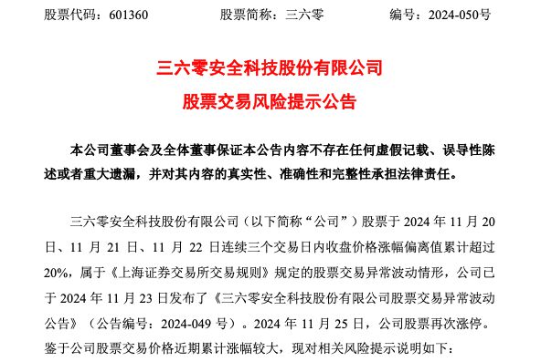 同日,三六零还发布股价异动公告称,公司股票于2024年11月20日、11月21日、11月22日连续三个交易日内收盘价格涨幅偏离值累计超过20%,属于《上海证券交易所交易规则》规定的股票交易异常波动情形。截至2024年11月21日,根据中证指数有限公司网站发布的最新行业数据,公司证监会行业分类信息传输、软件和信息技术服务业的行业平均静态市盈率为40.11,公司同日静态市盈率为负值,与同行业情况存在较大差异。敬请广大投资者注意二级市场交易风险,理性决策,审慎投资。