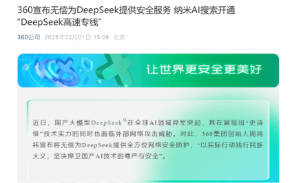 2月1日,360公司发文称,360宣布无偿为 DeepSeek 提供安全服务,纳米AI搜索开通“DeepSeek 高速专线”。