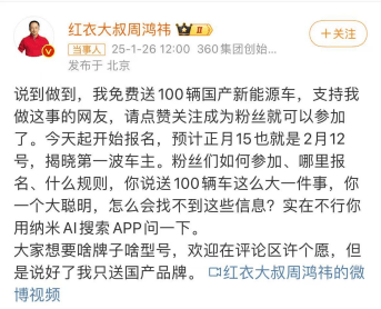 1月26日,周鸿祎在社交平台上官宣“送100辆国产新能源汽车”表示对纳米AI搜索用户和粉丝的感谢,用户需通过纳米AI搜索APP报名参与,预计2月12日揭晓第一波车主。