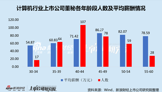 除去6位年龄信息缺失的董秘,其余353位董秘的年龄分布在30到60岁之间,且其年龄分布呈现典型的倒U型特征,其中40-44岁年龄段的董秘数量最多,为107位。而高薪年龄段则还要上移,计算机行业董秘薪酬在45-49岁达到顶峰,为86.27万元。