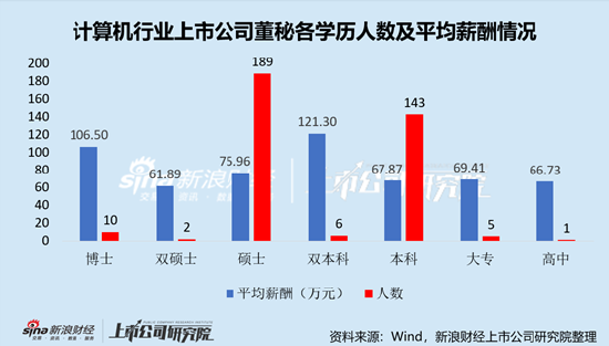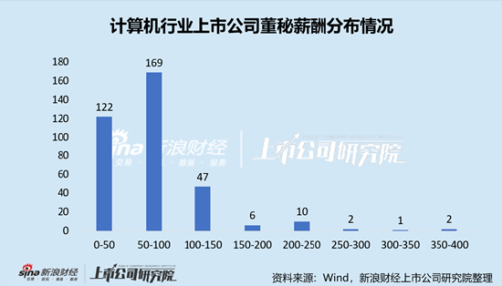 从计算机行业的薪酬分布角度来看,359位董秘中有291位的薪酬水平位于100万元以下,占比超八成,其中薪酬位于0-50万元区间的董秘有122位,位于50-100万元区间的董秘有169位。薪酬超过100万元的董秘仅有68位,薪酬超过250万元的董秘更是仅有2位。