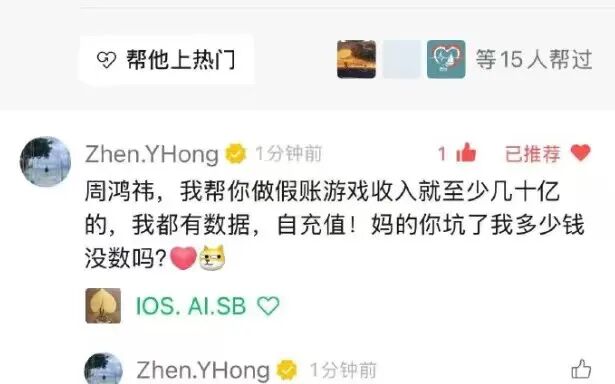 玉红直呼:帮周鸿祎做假账就至少几十亿,且保有数据。将会全网公布。他表示周鸿祎的游戏全部财务造假,并声称自己被坑了很多钱。