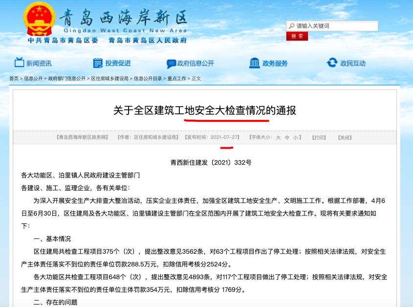 据青岛西海岸新区住房和城乡建设局官网近日发布了《关于全区建筑工地安全大检查情况的通报》(下称“通报”)。