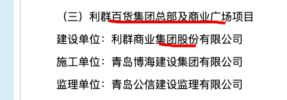 其中,通报批评项目名单中,利群百货集团总部及商业广场项目赫然在列,其建设单位:利群商业集团股份有限公司,施工单位:青岛博海建设集团有限公司,监理单位:青岛公信建设监理有限公司。