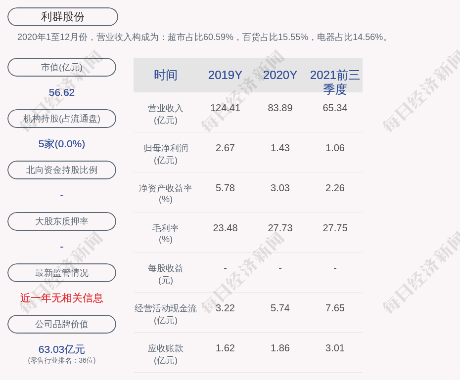 2020年1至12月份,利群股份的营业收入构成为:超市占比60.59%,百货占比15.55%,电器占比14.56%。