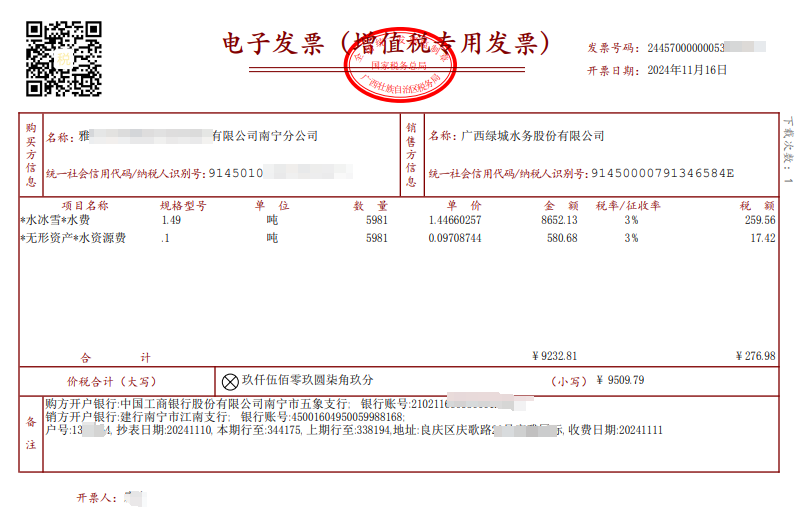 根据国家税务总局广西壮族自治区税务局发布的2023年第4号公告《关于开展全面数字化的电子发票试点工作的公告》要求,绿城水务积极响应国家数字化转型战略,深入推进水务数字化进程,自2024年10月起全面推行水费数电发票。