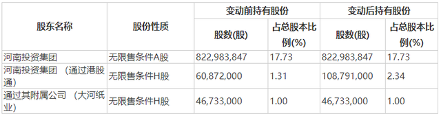 本次权益变动后,河南投资集团持有中原证券A股股份8.23亿股,通过港股通持有中原证券H股股份1.09亿股,通过其附属公司大河纸业(香港)有限公司持有中原证券H股股份4673.3万股,合计持有中原证券股份9.78亿股,占总股份比例为21.07%。