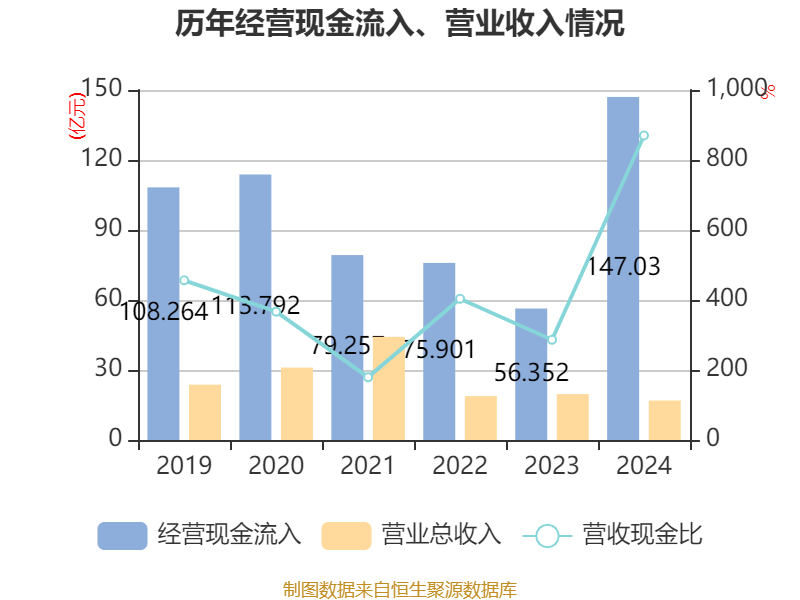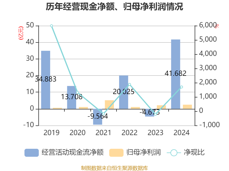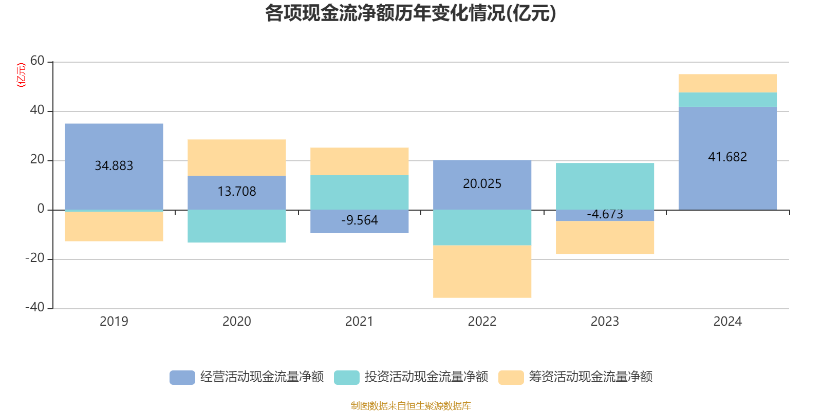 截至2024年,公司经营活动现金流净额为41.68亿元,同比增加46.35亿元;筹资活动现金流净额7.38亿元,同比增加20.66亿元;投资活动现金流净额5.87亿元,上年同期为18.91亿元。