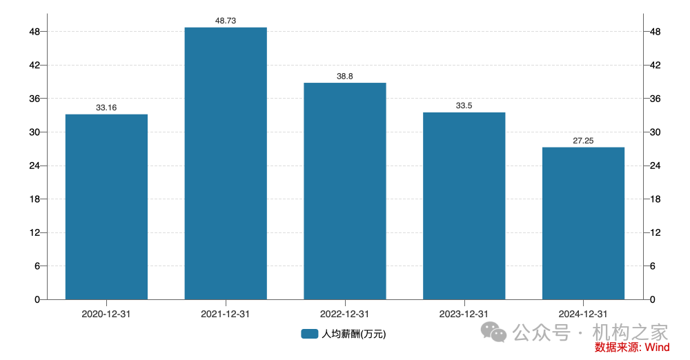 在薪酬策略方面,公司整体激励体系显著收紧。2024年员工薪酬总额为7.20亿元,同比减少22%;人均薪酬为27.25万元,较2023年的33.5万元下降18.7%。高管薪酬亦同步下降,董事长鲁智礼年薪为55.45万元,同比下降40%;总经理李昭欣为56.97万元,同比减少37.5%;首席投资官刘灏则以124.79万元的年薪居首位,但同比亦下降23%。整体薪酬策略与业绩表现保持一致,展现出一定的激励约束联动机制。