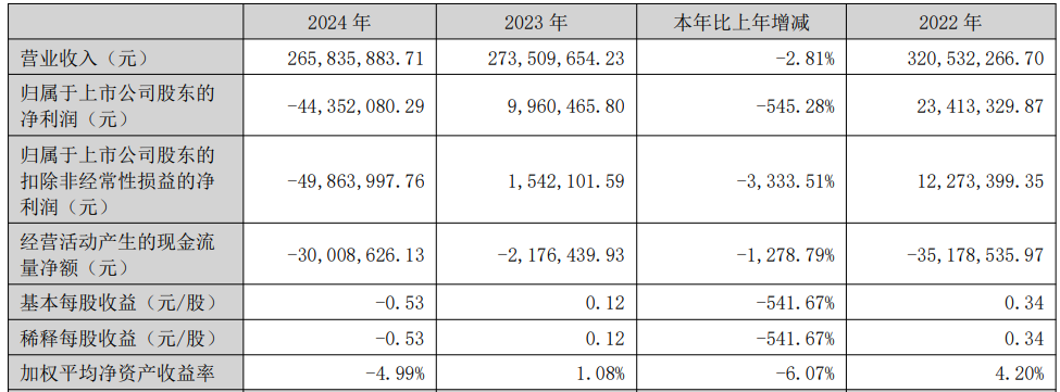 2024年,荣信文化的营业收入为2.66亿元,同比下降2.81%;归属于上市公司股东的净利润为-4435.21万元,上年同期为996.05万元;归属于上市公司股东的扣非净利润为-4986.40万元,上年同期为154.21万元;经营现金流净额为-3000.86万元,上年同期为-217.64万元。
