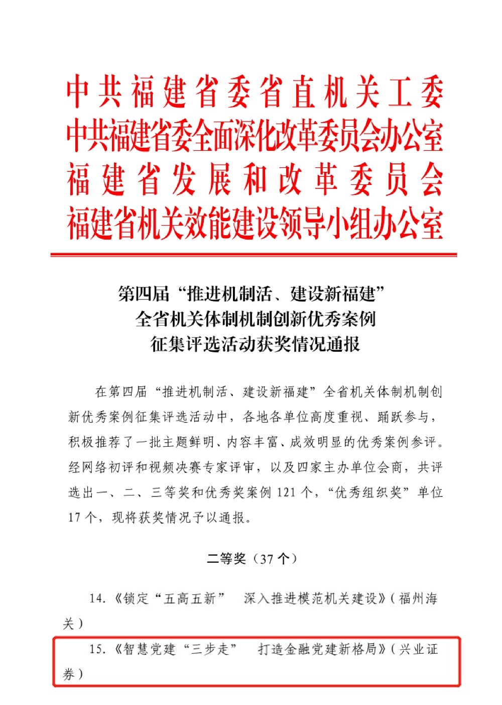 近日,福建省直机关工委、福建省发改委等四部门联合发布获奖通报,集团报送的《智慧党建“三步走”打造金融党建新格局》案例荣获第四届“推进机制活、建设新福建”全省机关体制机制创新优秀案例二等奖。这是兴业证券集团首次荣获此类奖项,彰显了集团党建工作良好成效。