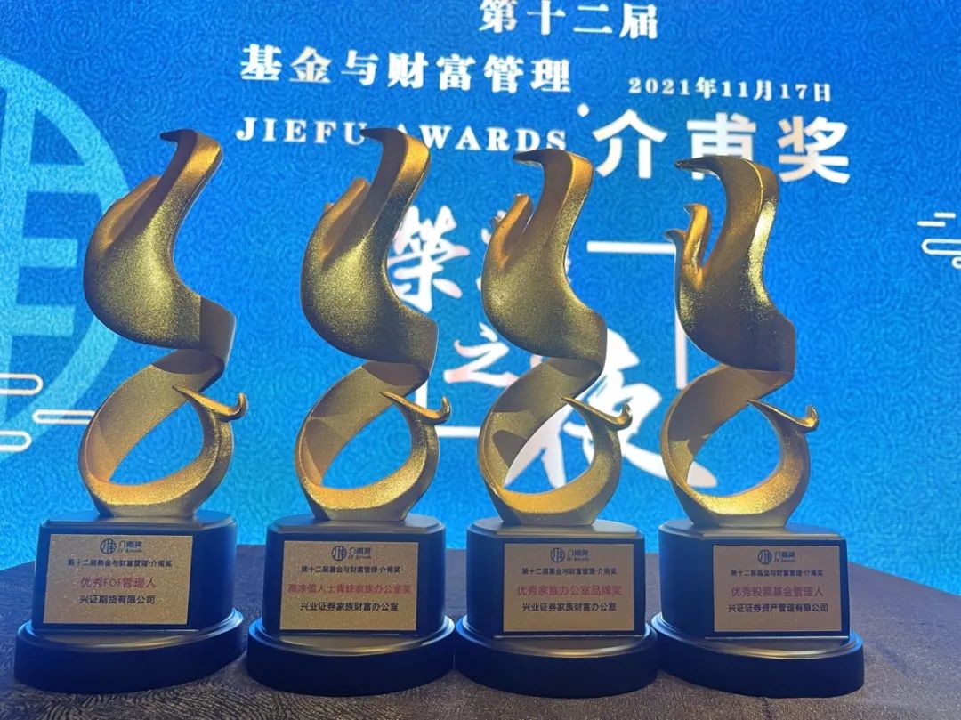 11月17日,在第十二届“基金与财富管理·介甫奖”评选当中,兴业证券荣获“高净值人士青睐家族办公室”和“优秀家族办公室品牌奖”两大奖项;兴证期货荣获“优秀FOF管理人”和“优秀CTA策略产品”双项殊荣;兴证资管荣获“优秀股票基金管理人”大奖。