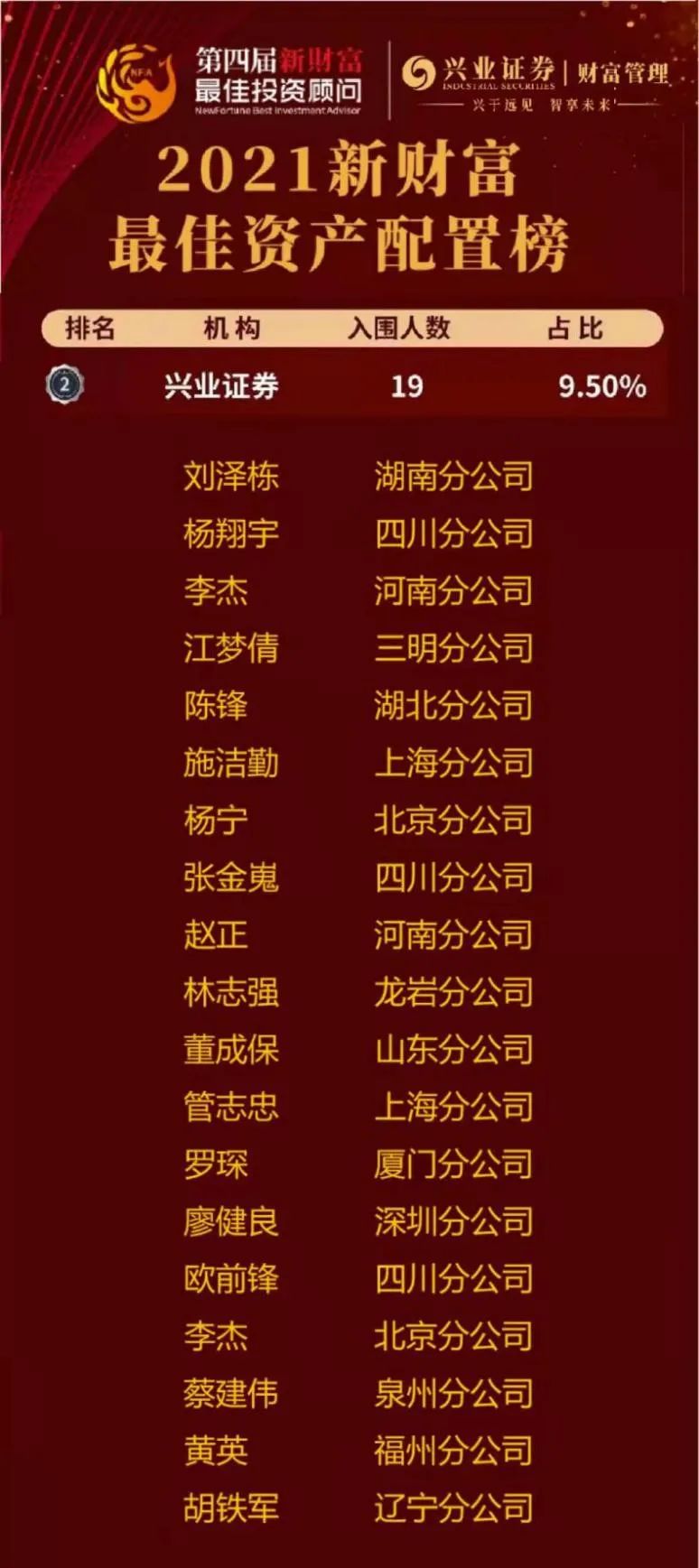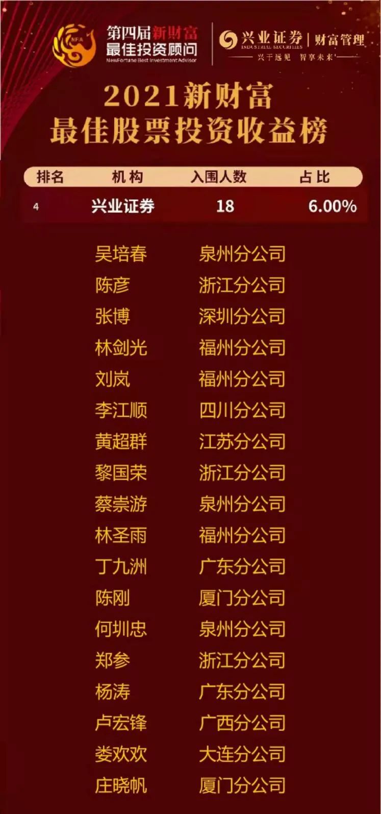 近日,第四届新财富最佳投资顾问评选活动第一阶段“投资管理能力评价”结果出炉,兴业证券凭借优异表现连续四年荣获“卓越组织奖”,并喜获本届评选“公募基金配置组”机构榜第二名、“股票交易组”机构榜第四名。