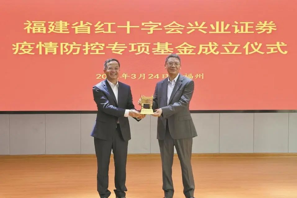 福建省红十字会党组书记何明华向兴业证券党委书记、董事长杨华辉颁赠“福建省红十字会博爱金鼎”。