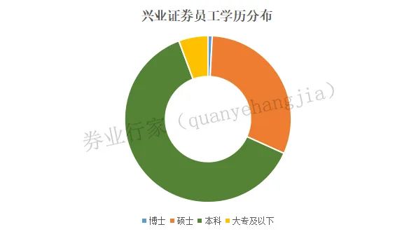 目前,兴业证券的在职员工中,博士占比0.82%,硕士占比30.02%,本科占比62.58%。