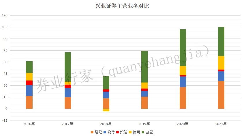 从历史数据来看,自2014年以来,兴业证券的营收和净利润平均年化增速分别为19.02%和15.01%,经纪、投行、信用和自营业务,均保持了两位数增幅。