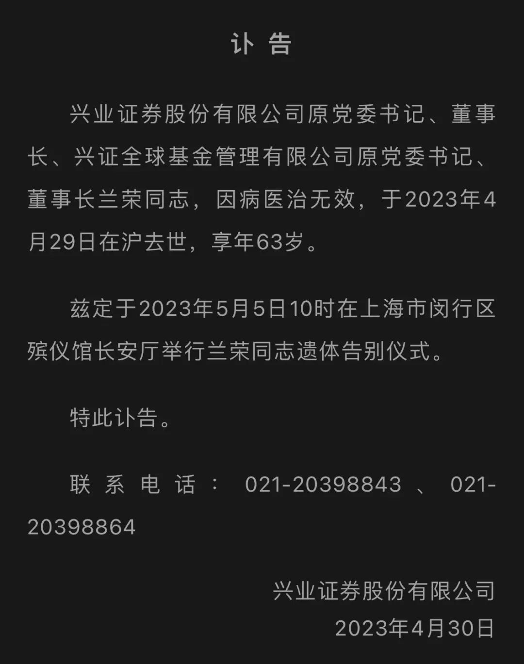 4月30日下午,兴业证券发布讣告称,公司原党委书记、董事长、兴证全球基金管理有限公司原党委书记、董事长兰荣同志,因病医治无效,于2023年4月29日在沪去世,享年63岁。