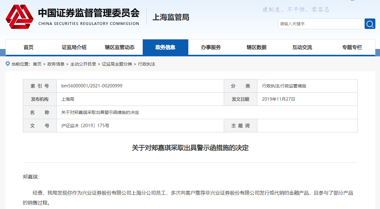 2019年11月,上海证监局发布《关于对郏嘉琪采取出具警示函措施的决定》称:“经查,我局发现你作为兴业证券股份有限公司上海分公司员工,多次向客户推荐非兴业证券股份有限公司发行或代销的金融产品,且参与了部分产品的销售过程。”