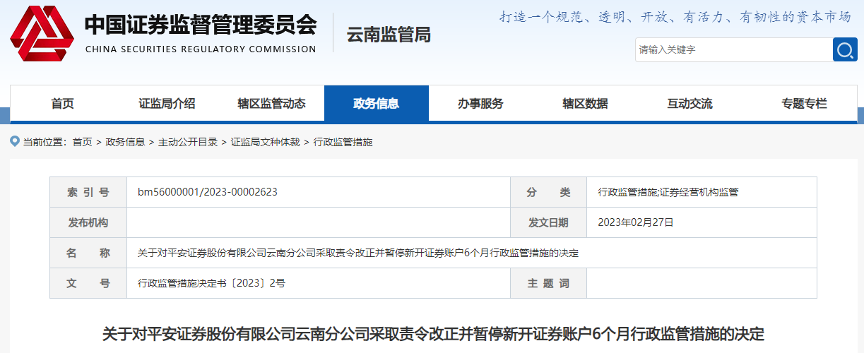 同时,该员工的相关行为也招致平安证券分公司被采取相应的行政监管措施。云南证监局同时发布公告称,对平安证券云南分公司采取责令改正,并暂停新开证券账户6个月行政监管措施的决定。