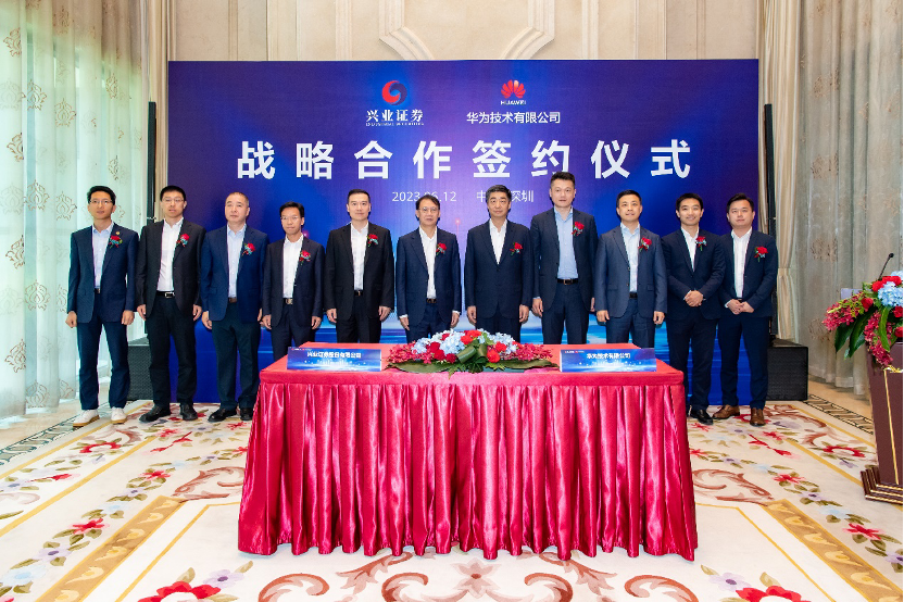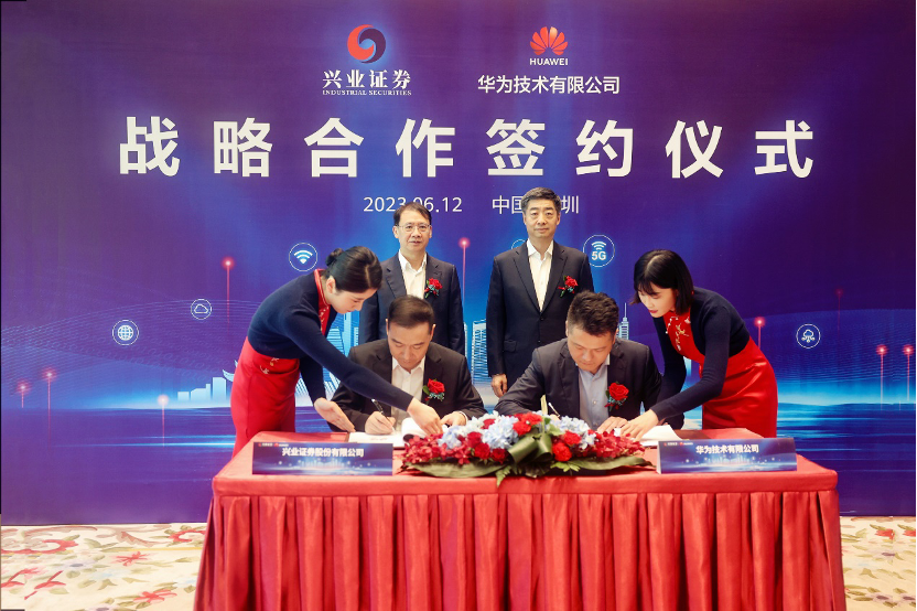 6月12日,兴业证券股份有限公司(以下简称“兴业证券”)与华为技术有限公司(以下简称“华为”)在深圳华为总部举行高层会谈并签署战略合作协议。兴业证券董事长杨华辉、首席信息官李予涛、首席财务官许清春,华为轮值董事长胡厚崑、华为数字金融军团CEO曹冲、华为福建省总经理彭希等出席。