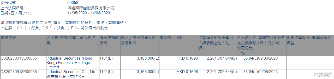 格隆汇6月14日丨根据联交所最新权益披露资料显示,2023年6月9日,兴证国际(06058.HK)获兴业证券股份有限公司在场内以每股均价0.1696港元增持316.8万股,涉资约53.73万港元。