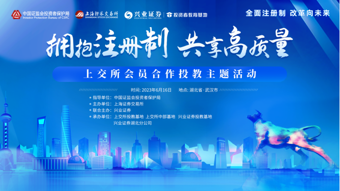 为做好全面实行股票发行注册制投资者教育保护工作,引导投资者客观看待和理解全面注册制的意义作用,理性参与投资,兴业证券积极响应上交所《关于开展2023年度会员合作投教活动的通知》号召,于2023年6月16日在上交所中部基地举办“拥抱注册制共享高质量”会员合作投教主题活动。