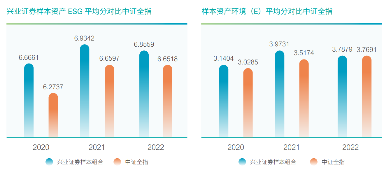 兴业证券在投资组合资产配置中持续考虑气候相关因素的影响,报告将样本资产ESG平均分、环境beta对比中证全指,显示兴业证券在标的选择上会更倾向于投资ESG表现更佳、环境表现更好的资产。
