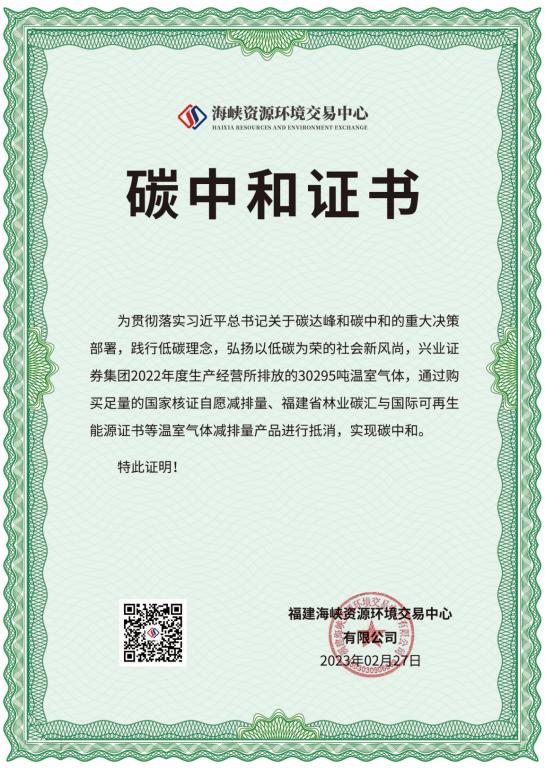 面向新的征程,金融企业在推进中国式现代化的伟大进程中,任重道远、责无旁贷。兴业证券表示,将继续以推动绿色发展彰显国有金融企业担当,迈出用金融力量守护“绿水青山”的坚定步伐,“以披露促管理”,以自身的高质量发展助力资本市场的高质量发展,为实现碳达峰碳中和目标贡献兴证“兴”力量。